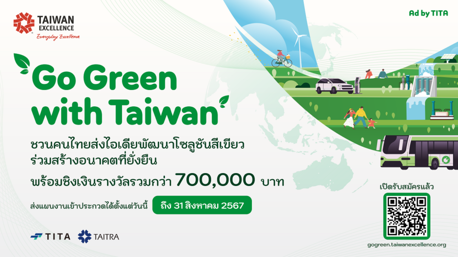 แคมเปญ “Go Green with Taiwan” จัดขึ้นโดยกรมการค้าระหว่างประเทศ (TITA) ภายใต้กระทรวงเศรษฐกิจ (MOEA) และดำเนินการโดยสภาส่งเสริมการค้าและการส่งออกไต้หวัน (TAITRA) เชิญชวนผู้ที่สนใจหรือใครที่มีไอเดียพัฒนาโซลูชันที่ยั่งยืน สามารถส่งแผนและสมัครเข้าร่วมโครงการตั้งแต่วันนี้ – 31 สิงหาคมนี้ ดูรายละเอียดเกี่ยวกับการรับสมัครได้ที่เว็บไซต์ gogreen.taiwanexcellence.org และเฟซบุ๊ก Taiwan Excellence TH หรือคลิกดูขั้นตอนการรับสมัครได้ที่นี่