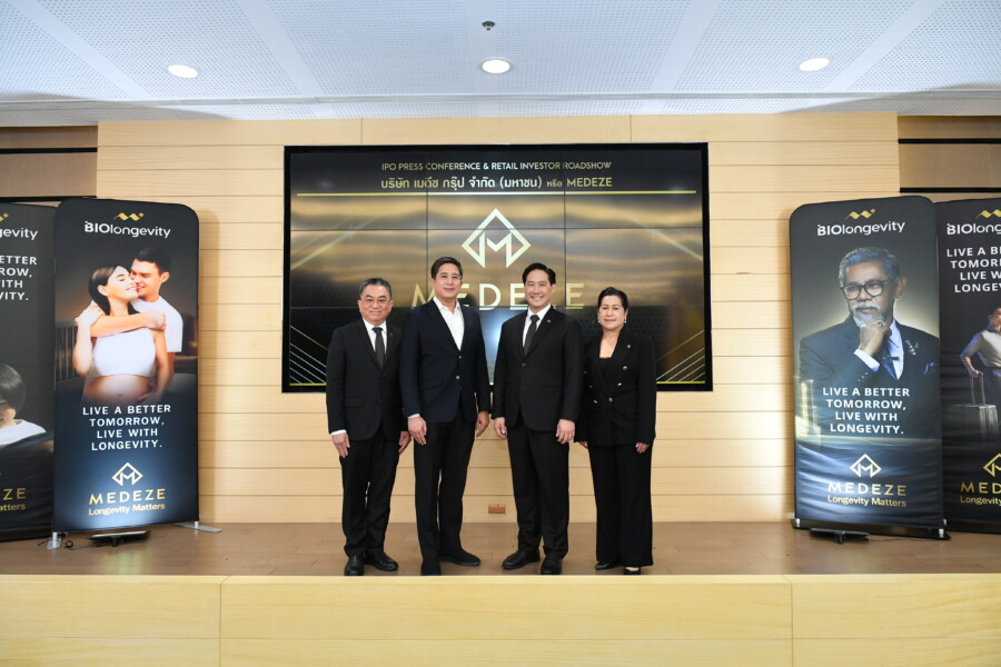 นายแพทย์วีรพล เขมะรังสรรค์ (ที่ 2 จากขวา) ประธานเจ้าหน้าที่บริหาร นางสาวสุภากาญจน์ กิจโกศล (ที่ 1 จากขวา) ประธานเจ้าหน้าที่สายบัญชีและการเงิน นายพิพัฒน์ พิศณุวงรักษ์ (ที่ 1 จากซ้าย) ประธานเจ้าหน้าที่สายบัญชีและการเงิน MEDEZE Treasury PTE. LTD. บริษัท เมดีซ กรุ๊ป จำกัด (มหาชน) หรือ MEDEZE ผู้ให้บริการตรวจวิเคราะห์ คัดแยก เพาะเลี้ยง และรับฝากเซลล์ต้นกำเนิด หรือ Stem Cells และตรวจศักยภาพเซลล์ภูมิคุ้มกัน หรือ NK Cells พร้อมด้วย นายพายุพัด มหาผล (ที่ 2 จากซ้าย) กรรมการผู้จัดการ ฝ่ายวาณิชธนกิจ บริษัทหลักทรัพย์ หยวนต้า (ประเทศไทย) จำกัด ในฐานะที่ปรึกษาทางการเงินและผู้จัดการการจัดจำหน่ายและรับประกันการจำหน่ายหุ้น ร่วมนำเสนอข้อมูลรายละเอียดหลักทรัพย์แก่นักลงทุนเพื่อเข้าจดทะเบียนในตลาดหลักทรัพย์แห่งประเทศไทย (SET) เพื่อเสนอขายหุ้นสามัญเพิ่มทุนให้กับประชาชนเป็นครั้งแรก (IPO) จำนวน 268 ล้านหุ้น ณ ห้องประชุม 603 ชั้น 6 อาคาร B ตลาดหลักทรัพย์แห่งประเทศไทย