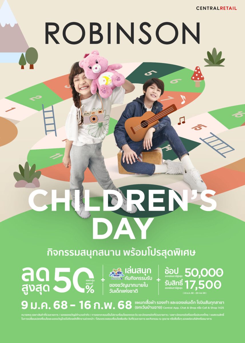 ห้างโรบินสัน ในเครือเซ็นทรัล รีเทล ตอกย้ำการเป็นเดสติเนชันที่สร้างความสุขในทุก ๆ วันของชีวิตครอบครัวทั่วไทย พร้อมร่วมต้อนรับเทศกาลวันเด็กปี’68 จัดแคมเปญ “Robinson Children’s Day” (โรบินสัน ชิลเดรนส์ เดย์) ชวนคุณพ่อ คุณแม่ พาลูก ๆ มาปักหมุดเช็คอินสัมผัสประสบการณ์สุดสนุก และโปรโมชันสุดพิเศษแบบจัดเต็ม ตั้งแต่วันที่ 9 ม.ค. 68 – 16 ก.พ. 68 ที่แผนกเสื้อผ้า รองเท้า และของเล่นเด็ก ห้างโรบินสันทุกสาขา (ยกเว้นสาขาบ้านฉาง) รวมทั้งหลากหลายช่องทางการช้อปปิ้งสุดสะดวกของห้างฯ