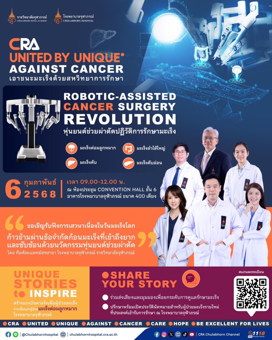 ราชวิทยาลัยจุฬาภรณ์ ขอเชิญผู้ป่วยมะเร็ง ญาติ และผู้ที่สนใจเข้าร่วม กิจกรรมเนื่องในวันมะเร็งโลก CRA United by Unique Against Cancer “เอาชนะมะเร็งด้วยสหวิทยาการรักษา” ROBOTIC-ASSISTED CANCER SURGERY REVOLUTION (หุ่นยนต์ช่วยผ่าตัดปฏิวัติการรักษามะเร็ง) มะเร็งต่อมลูกหมาก มะเร็งลำไส้ใหญ่ มะเร็งตับ มะเร็งตับอ่อน