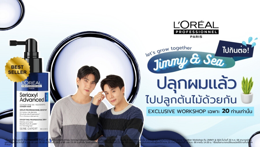 แล้วเตรียมมาพบกับ 2 หนุ่มหล่อใกล้ฉัน จิมมี่ – จิตรพล โพธิวิหค และ ซี – ทวินันท์ อนุกูลประเสริฐ แบบเอ็กซ์คลูซีฟ ในกิจกรรม “Let’s Grow Together” ชวนไปปลูกต้นไม้ วาดรูป ออกแบบและปั้นเครื่องปั้นดินเผา อย่างใกล้ชิดกับทั้ง 2 หนุ่ม ในวันที่ 20 กรกฎาคม 2568 สำหรับ 20 ผู้โชคดีที่มียอด ช้อปสูงสุด เพียงรวบรวมใบเสร็จจากการช้อปปิ้งสินค้า L’Oreal Professionnel จากช่องทาง Shopee (shopee.co.th/loreal_professionnel_official) ระหว่างวันที่ 8 – 23 มิถุนายน 2568 โดยทุกใบเสร็จจะต้องมีผลิตภัณฑ์ Serioxyl Advanced Densifying Serum ขนาด 90 ml อย่างน้อยหนึ่งชิ้นต่อใบเสร็จ เขียนชื่อนามสกุลท้ายใบเสร็จทุกใบ แล้วลงทะเบียนพร้อมส่งภาพใบเสร็จดังกล่าวมาที่ L’Oreal Professionnel Line Official @lorealproth (https://lin.ee/JnCMuiX) ติดตามรายละเอียดเพิ่มเติม และประกาศรายชื่อผู้โชคดี วันที่ 10 กรกฎาคม 2568 ที่ Facebook L’Oreal Professionnel Thailand และ L’Oreal Professionnel Line Official