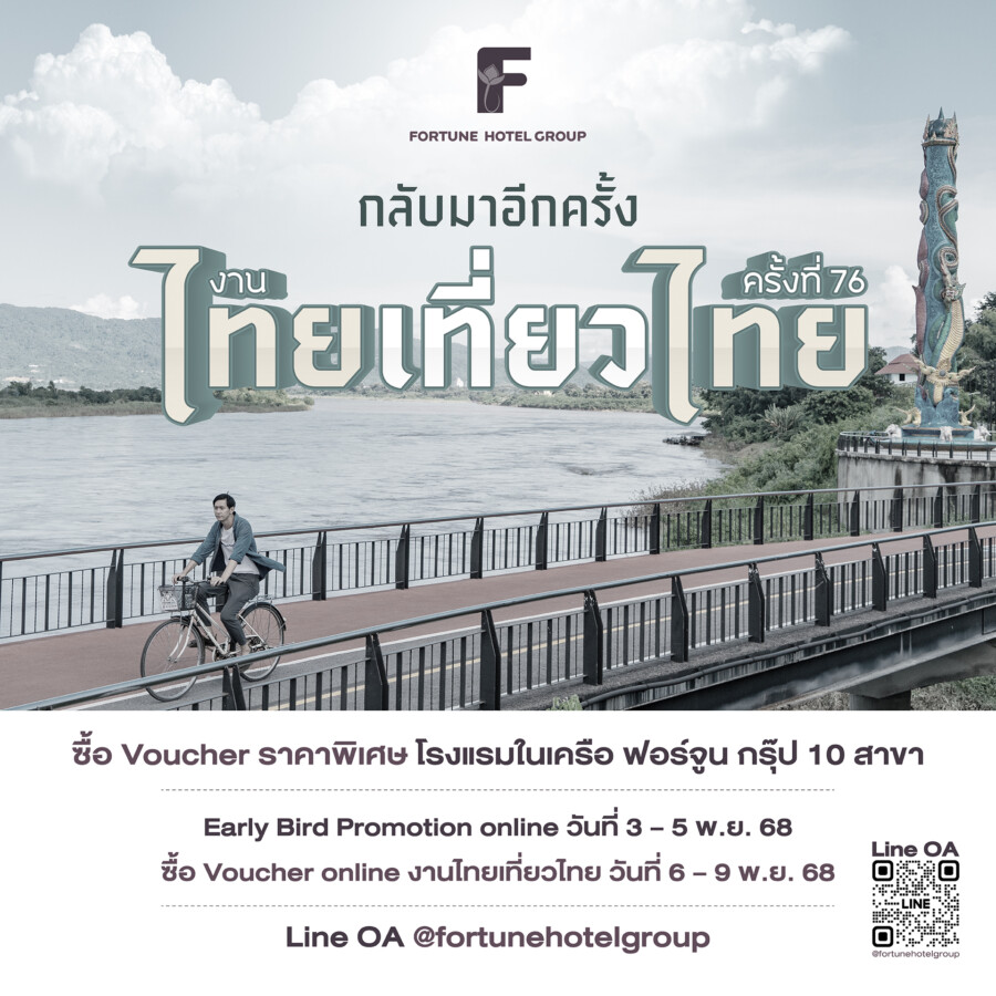 กรุงเทพฯ – ฟอร์จูน โฮเทล กรุ๊ป (Fortune Hotel Group) ในเครือ บริษัท ซี.พี.แลนด์ จำกัด (มหาชน) ชวนเที่ยวงานมหกรรมท่องเที่ยวสุดยิ่งใหญ่ “ไทยเที่ยวไทย ครั้งที่ 76” ที่ครั้งนี้ เครือโรงแรมฟอร์จูน กรุ๊ป (Fortune Group Hotels) ขนข้อเสนอสุดพิเศษมามอบให้สายเที่ยวทั่วไทย กับ Voucher ห้องพักราคาสุดคุ้มกว่า 10 สาขาทั่วประเทศ ให้คุณเลือกพักได้อย่างอิสระ ทั้งภูเขา ทะเล แม่น้ำ และใจกลางเมือง
