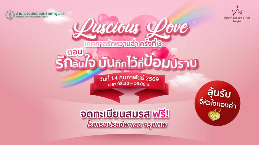 โรงแรมปรินซ์พาเลซ กรุงเทพ ขอเชิญคู่รักร่วมเฉลิมฉลองเทศกาลแห่งความรัก กับกิจกรรมจดทะเบียนสมรสฟรี เนื่องในวันวาเลนไทน์ ประจำปี 2569 ภายใต้ชื่องาน “Luscious Love เทศกาลรักหวานฉ่ำ ครั้งที่ 3” ตอน รักล้นใจ บันทึกไว้ที่ป้อมปราบ ซึ่งจัดขึ้นอย่างต่อเนื่องเป็นปีที่ 3 เพื่อส่งเสริมสถาบันครอบครัว และสร้างช่วงเวลาแห่งความทรงจำอันทรงคุณค่าสำหรับคู่รัก